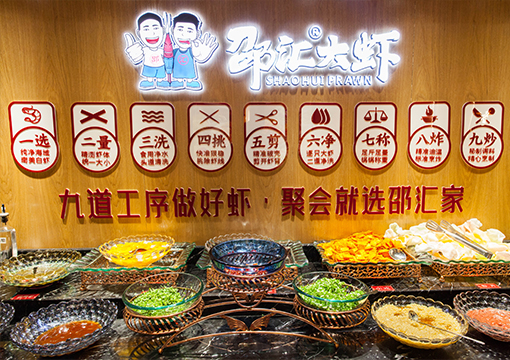 邵匯大蝦擁有強大的后勤保障部門,核心底料由公司中央工廠集中配送,食材精選進口大蝦,搭配秘制底料制作而成,研發出一鍋兩吃的飲食模式(先吃蝦后涮菜,葷素搭配隨心選),打造出綠色健康的飲食新文化。